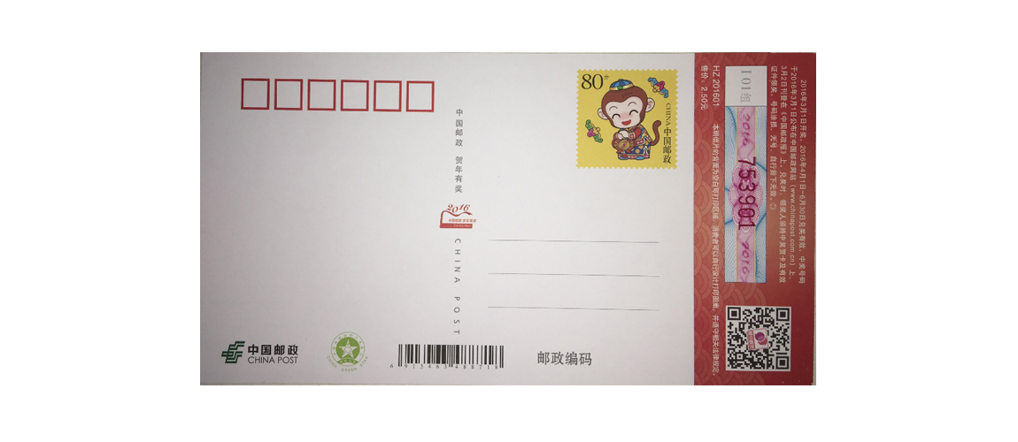 【藏品名稱】:自創(chuàng)型HZ2016 賀年郵資明信片