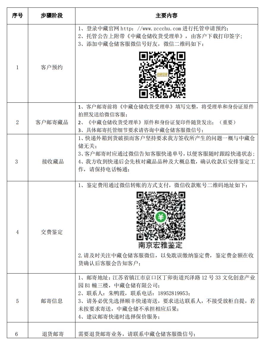 經合作平臺申請,中藏倉儲有限公司(以下簡稱本公司)研究決定,啟動以下藏品的再托管鑒定入庫流程,本公司將對藏品進行統一鑒定,具體事項公告如下: