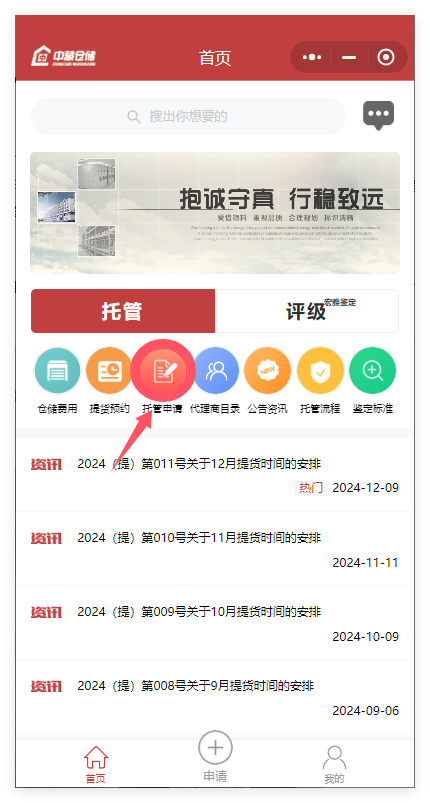 ③進入中藏倉儲小程序后,點擊“托管申請”;
